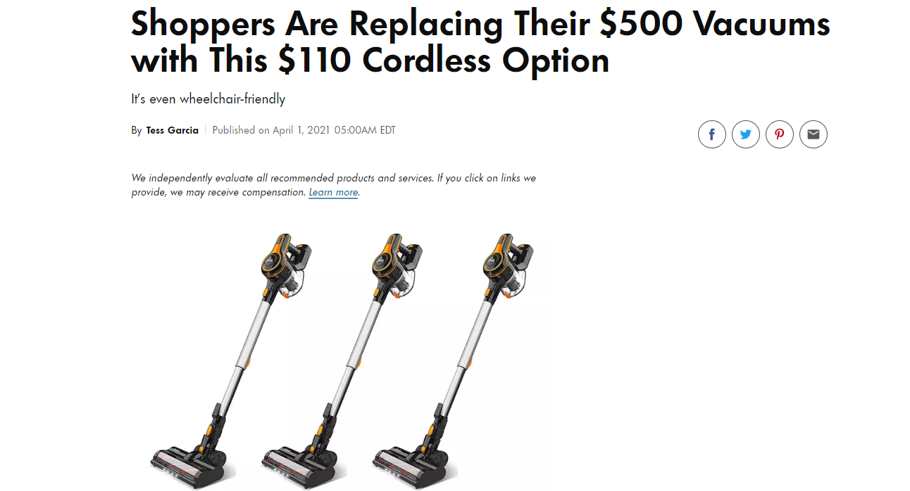 "The Inse S600 Cordless Stick Vacuum Cleaner, which shoppers say is so user-friendly, it can be operated from a wheelchair " on its blogs - Shoppers Are Replacing Their $500 Vacuums with This $110 Cordless Option.