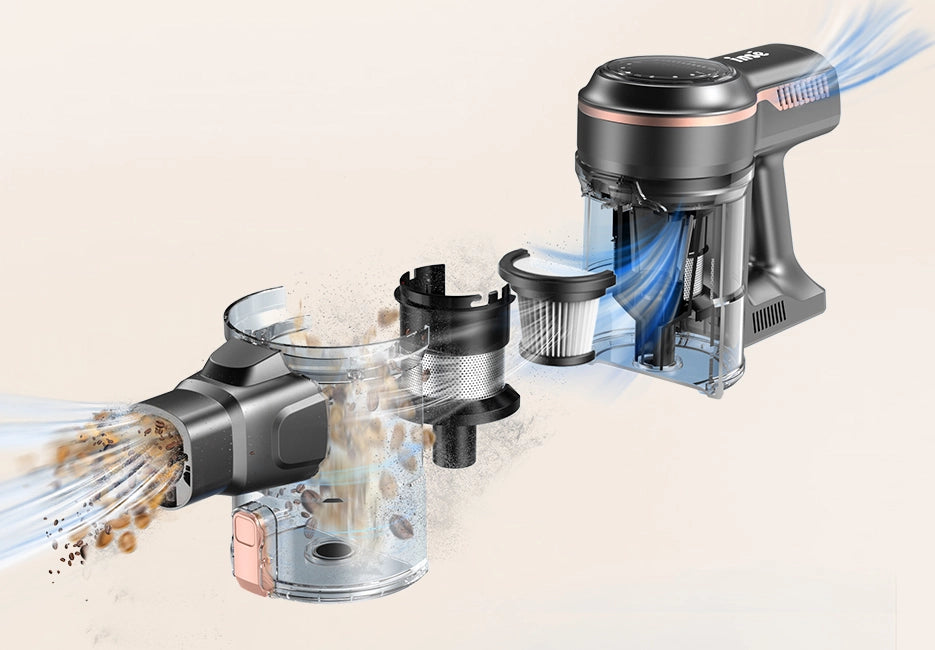 Big debris is kept in the dustbin, and the remaining dirt and dust are then filtered by a metal mesh filter followed by a HEPA filter, and finally through a built-in air outlet filter in the motorhead. Finally, clean, fresh air is released, securing a wholesome environment.