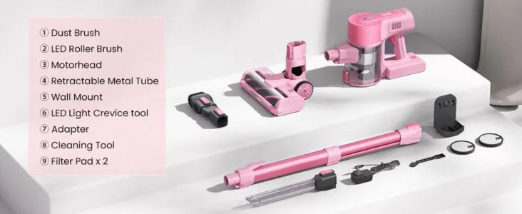 Versatile and Lightweight (6-in-1): The versatile attachments can switch the vacuum to be handheld, providing six different combinations. It is suitable for various scenarios, including furniture, ceilings, stairs, or cars. This enhances the convenience of cleaning hard-to-reach areas.