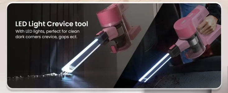 User-friendly Design & LED Crevice Tool: A single click can trigger continuous operation mode, and the inclusion of LED lights on the crevice tool reveals hidden dust in dark corners.