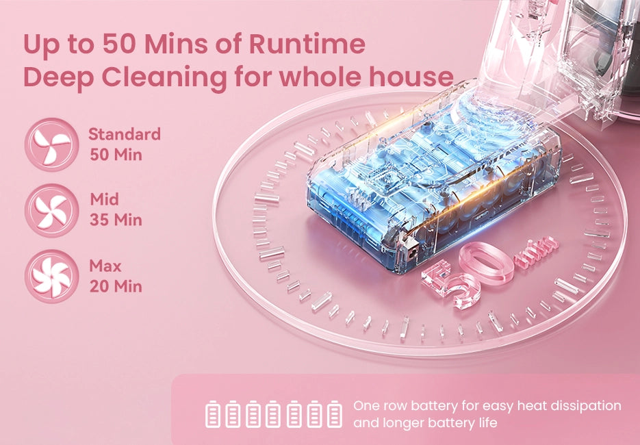 Long Battery Life (50 mins): Equipped with a 7 x 2500mAh rechargeable battery, this vacuum ensures up to 50 minutes of uninterrupted cleaning. It allows for sweeping multiple rooms or the entire house without breaks. The detachable battery can be charged separately, providing added convenience.