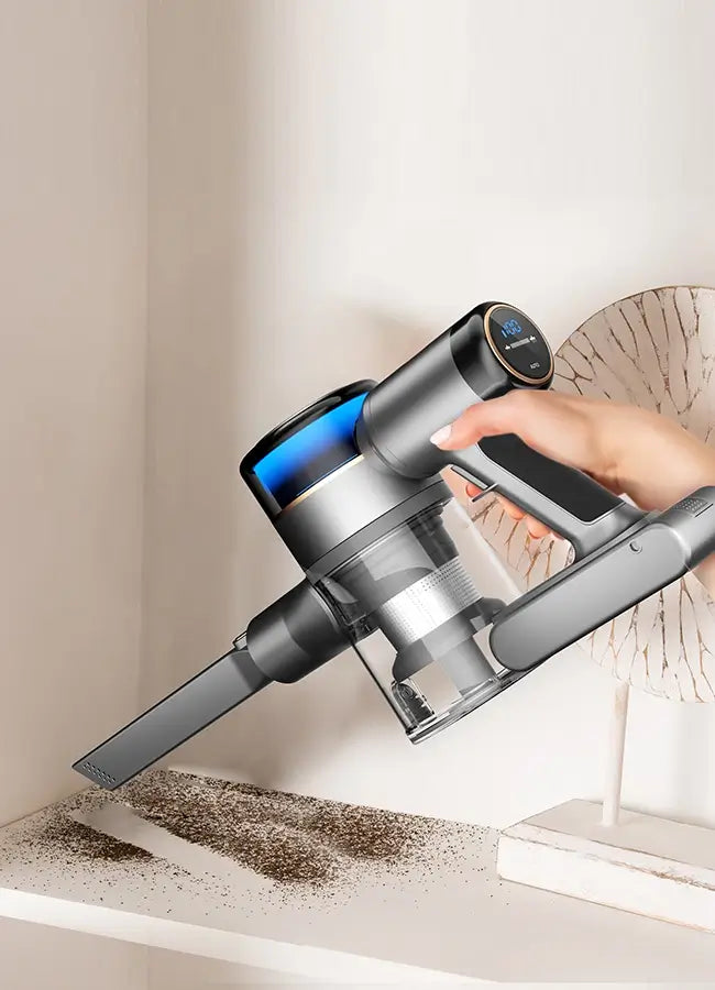 Easily monitor the battery level with an innovative ring light design. The unique blue, purple, and red lights indicate battery levels of 75%-100%, 40%-74%, and 0%-39%, respectively. (Note: a flashing red light indicates the battery is less than 10%). It also features an LED display that provides real-time updates on the battery level, suction power mode, and automatic dust detection, allowing you to effortlessly stay on top of your cleaning game.